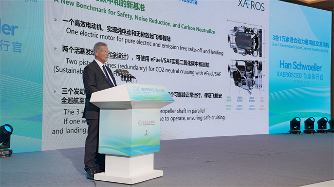 活动首日,XAEROS飞机发动机发明者Hans Schwoeller先生围绕三倍冗余混合动力新引擎技术、节能低碳减排等核心产品优势发表演讲,并与来自全球的三百余名企业家和专家学者共论通用航空未来发展。