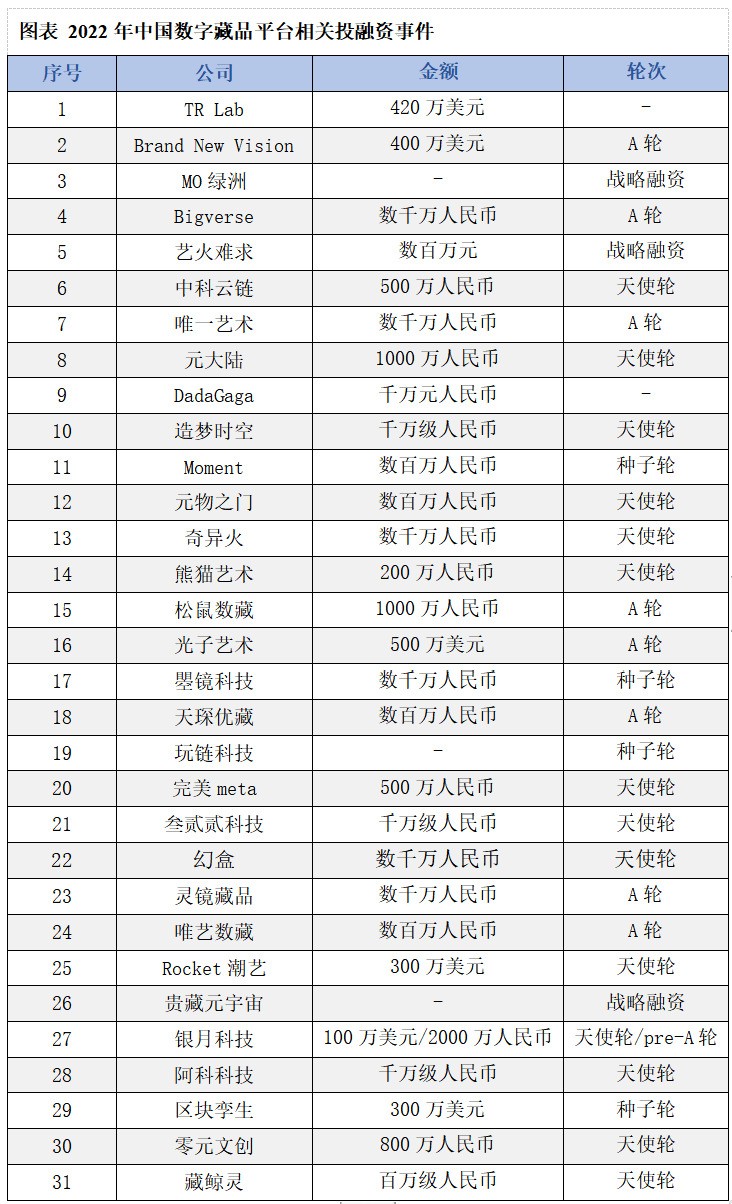从时间线来看,2022年上半年获得投资的企业数量为7家,即便是在泡沫开始破灭的下半年,依然有24家企业获得投资。在政策不确定性尚存、消费回归理性、数字藏品泡沫轮番破灭的当下,还是有不少资本依然选择相信数字藏品的长期价值。一边是“清退潮”的出现,另一边是众多资本的投资,数字藏品市场在2022年下半年可谓“冰火两重天”。